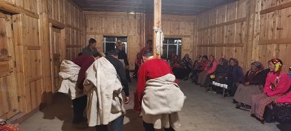 夜臨了,月低垂,整條山谷陷入了藍(lán)色的世界,近處是墨綠,遠(yuǎn)處是淡綠,雄渾的大山在綠的撫摸下也變得婀娜起來(lái);古老寨子的火塘也燃起來(lái)了,勞作了一天的普米人聚在一起,跳起了原始氏族人群圍火而舞的傳統(tǒng)舞蹈,曲調(diào)悠揚(yáng)且古樸動(dòng)人。
