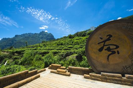 待日上三竿,陽(yáng)光斜射穿越云霧,采茶姑娘身著客家服,藍(lán)黑格調(diào),綴以手繪圖紋,頭戴角形斗笠。嫣然而笑。瞬間清潤(rùn)心間,討一捧新茶至云上茶居,沏茶邀友。