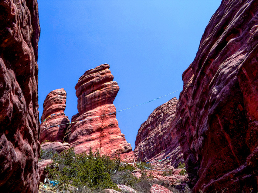 另一方面,阿色丹霞與四川盆地邊緣那些由“膚質(zhì)細(xì)膩”的紅色砂巖、泥巖形成的丹霞地貌也有差異。當(dāng)我走近觀察,發(fā)現(xiàn)有一些活潑的小型、微型“雕塑”呈現(xiàn)眼前,有柱狀石峰、孤立石柱、筍狀石芽,更有的似盤(pán)羊、野兔、小鳥(niǎo),因?yàn)橛羞@種大大小小的造型石隨意點(diǎn)綴,給這片紅色世界平添了許多趣味。