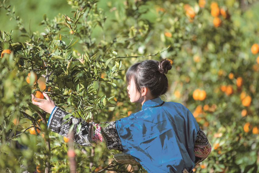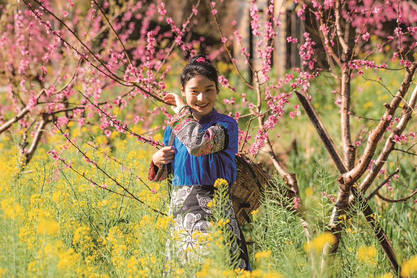 陽春三月,驅(qū)車百里,峰回路轉(zhuǎn),至一小鎮(zhèn),喚烏拉溪,為古驛站。背夫崖下,峻山環(huán)護,小河繞村,屋舍散落,白墻灰瓦,綴以紅檐,桃花夭夭,棧道蜿蜒??图倚∨嘁聥扇?,穿行花間,簪花比俏。昔日荒坡,綠樹成蔭,繁花之下,草莓豆莢,青果胡豆,蔓草芳苓。