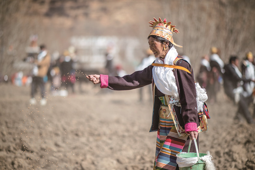 近日,西藏農(nóng)民舉行一年一度春耕大典。村民沿襲著傳承千年的春耕民俗,身著節(jié)日盛裝,手捧“切瑪”(五谷豐登斗),唱起祈愿歌,互敬青稞酒。當(dāng)鐵犁翻開(kāi)土地,婦女將手中的種子撒下,祈求新的一年豐收。