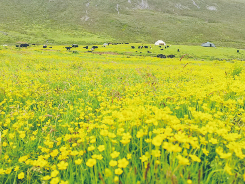 其春,草木萌發(fā),百花如星,牛羊蕃盈。格桑琦繡,似明珠璀璨,光華四溢,一番春光乍泄,芳菲漫天。