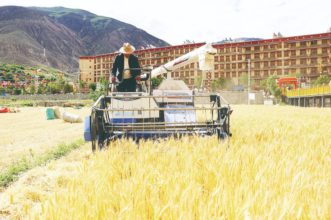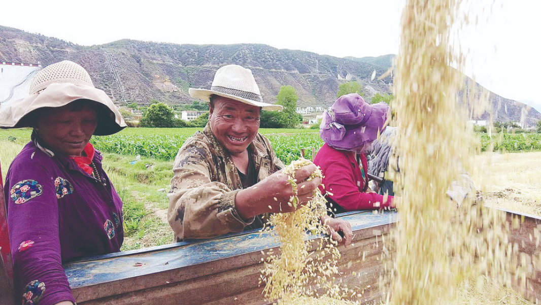我州各地青稞、小麥陸續(xù)進(jìn)入成熟期,眼下正值“雙搶”關(guān)鍵期。放眼望去,在廣袤的田野上,一片熱火朝天的繁忙景象。村民們頭頂烈日,腳踏泥土,緊張而有序地投入到“雙搶”工作中。新型農(nóng)具為“雙搶”注入強(qiáng)大動(dòng)力,收割機(jī)在田間往來穿梭,一顆顆飽滿的麥粒從倉(cāng)門傾瀉而下,源源不斷地被送上拖拉機(jī),將成熟的小麥、青稞迅速收割歸倉(cāng),展現(xiàn)出一幅喜慶熱鬧的豐收畫卷。