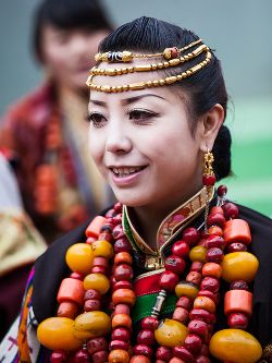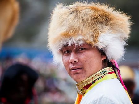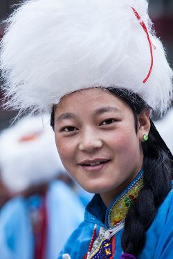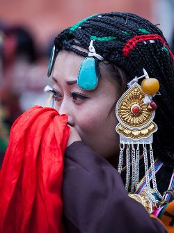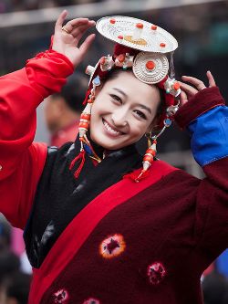 藏裝的基本特點(diǎn)是長(zhǎng)袖、寬腰、大襟、肥大。直線寬邊,色彩對(duì)比強(qiáng)烈。男女藏袍均習(xí)慣以粗紡厚毛呢為料,左襟大,右襟小,一般在右腋下釘一個(gè)紐扣,或是用紅、藍(lán)、綠、雪青等色布做兩條飄帶,穿時(shí)結(jié)上。男式藏袍多為黑、白兩色,領(lǐng)圍、袖口、衣襟和底邊,鑲上色布或綢子底邊,古樸渾厚。夏天或勞動(dòng)時(shí),一般只穿左袖,右袖從后面拉到胸前搭在左肩上,也可左右袖均不穿,兩袖束在腰間,古銅色的皮膚袒露于外,雄風(fēng)凜凜,彪悍剛健。女式藏袍,分有袖和無(wú)袖的兩種,夏秋兩季的藏袍無(wú)袖。里面多襯有紅、綠等色彩鮮艷的襯衣,襯衣翻領(lǐng)在外,衣袖要長(zhǎng)于胳膊一至二倍,長(zhǎng)出部分,平時(shí)卷起,舞蹈時(shí)放下,舒展飄逸,瀟灑自如。藏族的帽子式樣繁多,各地均有不同,拉薩等地以金寶頂帽為最多,用金絲或銀絲繡織圖案,在陽(yáng)光照耀下,閃閃發(fā)光。金花帽是男女老幼都喜歡戴的民族帽。男女穿的藏靴,底高二寸,靴腰高至小腿以上,靴面用紅綠相間的毛呢裝飾,繡有圖案花紋。靴頭向上隆起。藏族男女喜歡佩飾。耳穿大環(huán),手腕金銀,頂戴珠鏈,尤其是在腰間,男挎長(zhǎng)劍,女佩腰刀,更顯得粗獷彪美。