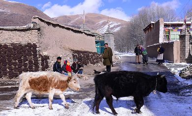 8、甘孜縣城郊雪山下的也哈村,雪后初睛,村民們?cè)趬菚裉?,生活悠然而恬靜。