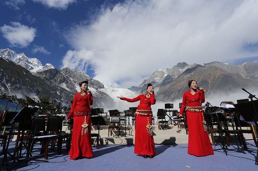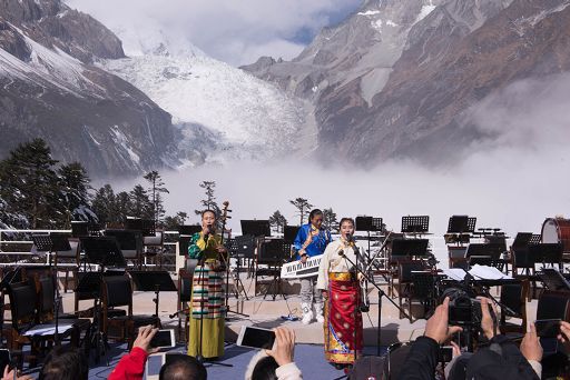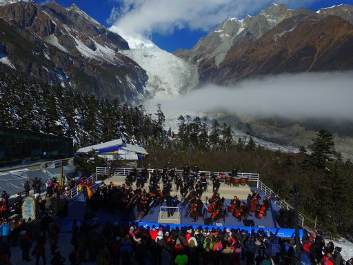 四號(hào)營(yíng)地,晴空萬(wàn)里、風(fēng)和日麗,清澈的高原天空藍(lán)得澄明醉人,來(lái)自四川交響樂(lè)團(tuán)和民間的200多位樂(lè)手共同在海拔3500米的冰川瀑布之下演奏了《青藏高原》、《向往神鷹》、《菊花臺(tái)》等歌曲。
