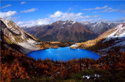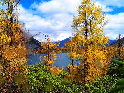 丹巴的秋是有著美麗色彩的季節(jié),你瞧,在峽谷兩岸的山巔,那一簇簇綠樹在一夜之間竟然點(diǎn)綴上了黃的、紅的顏料,就像是一名丹青能手不小心間打翻了調(diào)色盤,讓那些靈動(dòng)的顏料在樹冠上潑灑。黃色的樹葉正印證了“滿樹盡帶黃金甲”的意境,黃得透徹,黃得潔凈。而那些紅色的樹葉,猶如盛開的鮮花,在逐漸蕭條的秋日里顯露出勃勃生機(jī)……那一片片黃紅綠相間的顏色,一寸一寸的往下挪移,讓看慣了春色綠野滿山的人們驚呼大自然的鬼斧神功之作。山腰,蔥綠的樹一棵連著一棵,密密層層,頑強(qiáng)地抵抗著秋風(fēng)的寥落,然而,那黃的紅的顏料終歸于要流向峽谷底,所經(jīng)之處,風(fēng)刺骨,葉瑟縮,大地又將再次被剝蝕掉華麗的外衣,露出山的嶙峋。我想,在山巔,那些樹葉在秋寒的作用下,依依不舍地與樹枝作別,隨風(fēng)抖落,在樹林中上下翻飛,猶如一只只美麗的彩蝶在林中翩翩起舞,當(dāng)落到地面上時(shí),發(fā)出生命即將逝去時(shí)的低低嘆息聲,然而那哀傷卻沒有醞釀太久,幾只小蟲迅速地聚集在葉片底下,為尋找到過冬的庇護(hù)所而興奮不已,那些葉片也感受到了生命存在的意義,為自己即將化為塵土前還能再次發(fā)光發(fā)熱而激動(dòng)。跟隨著秋的步伐,獨(dú)自一人穿行在秋色滿滿的樹林中。眼前,一片片落葉漫空飛舞,伸出雙手,讓那些黃的紅的葉片降落在手心里,一絲淡淡的蘋果香味從小小的葉片中透出,悠悠的在我鼻尖縈繞。那一片片落葉,不正是秋日向大地母親發(fā)出的明信片嗎!春夏兩季,大地母親用自己的乳汁哺育著這些葉片,泛著健康的綠色,渲染了大地,茁壯的成長。那透心的綠,將大地裝扮得格外的妖嬈,充滿了無限的活力。秋日漸近,它們?cè)谇镲L(fēng)的浸透下,剝蝕掉綠色的外衣,消耗掉多汁的綠葉,逐漸的消瘦,最后薄如蟬翼,在秋風(fēng)的吹拂下,在大地母親的召喚下,終于脫離枝條,晃晃蕩蕩的飄向地面。