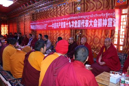 宣講團(tuán)成員勇勇用藏語激情洋溢的宣講黨的十九大精神,現(xiàn)場(chǎng)不斷響起熱烈的掌聲。當(dāng)勇勇講到我國(guó)五年來取得的輝煌成就時(shí),僧人們都激動(dòng)不已,紛紛為發(fā)展成就點(diǎn)贊?!奥犃私裉斓男v,我進(jìn)一步了解到了我們國(guó)家這些年來取得的發(fā)展成就。一直以來,黨對(duì)我們的關(guān)懷是看得見摸得著的,現(xiàn)在我們的寺廟管理越來越規(guī)范,基礎(chǔ)設(shè)施也得到了完善,通往寺廟的道路也有了明顯改善,我們的生活越來越好了,這一切都是共產(chǎn)黨的功勞。”寺廟僧人尺乃表達(dá)著對(duì)黨的感恩。
