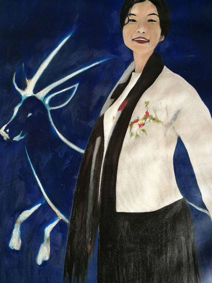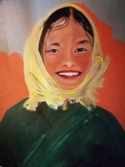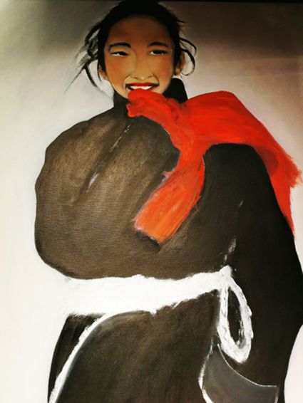 畫畫三年多了。十三歲寫詩;到了高原后,方開始創(chuàng)作長篇小說。在上海,我做過畫廊。但要說斗膽動筆畫幅肖像。我是在白度母唐卡前燃了三炷香的。包括在咖啡店現(xiàn)場作畫。到京城繼而國外辦畫展,我認(rèn)為都是因了我把畫布當(dāng)成了詩稿的緣故。于是,大家喜歡我這種野路子,天馬行空,可又不舍方圓的創(chuàng)作手法。接下來,歐洲、東京還會有我的系列展覽。