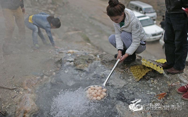 這里的溫泉很有趣,在石頭里能傳來水燒開后的聲響,而在露天的溫泉眼,水花噴涌,溫泉的溫度很高,據說有90度,我們拿了好多雞蛋,用漏勺盛著,放進去煮,幾分鐘后,就熟了。蛋黃完全凝固了,可見溫度是很高的。