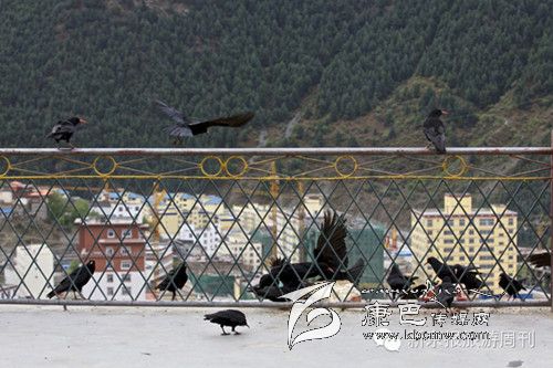 白玉縣,白玉寺紅嘴烏鴉停在欄桿邊覓食。