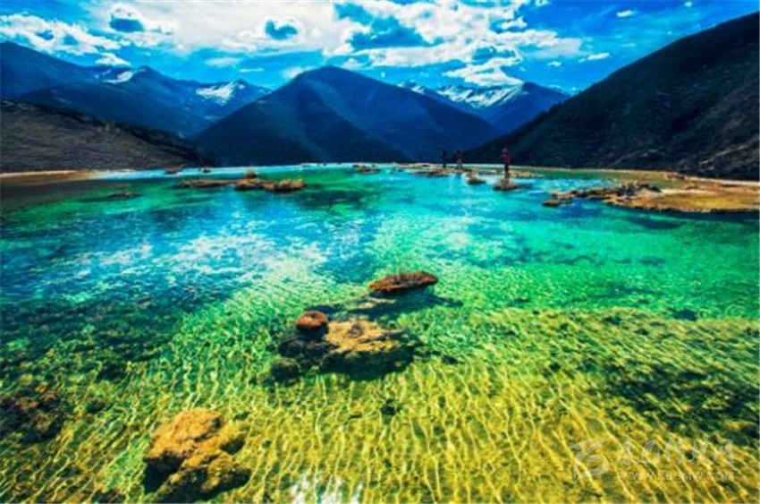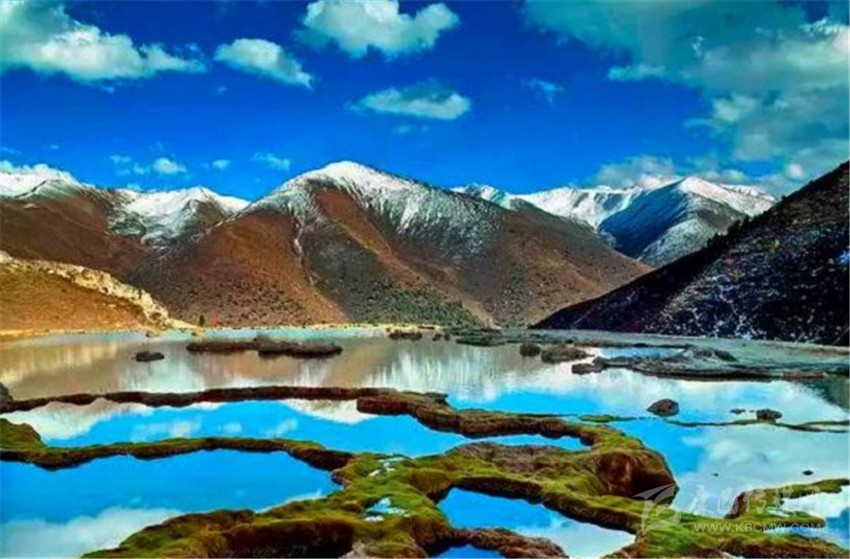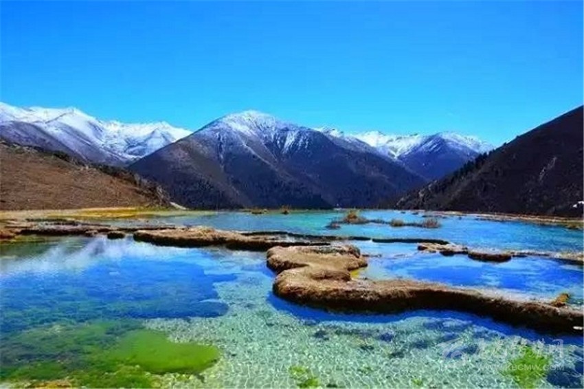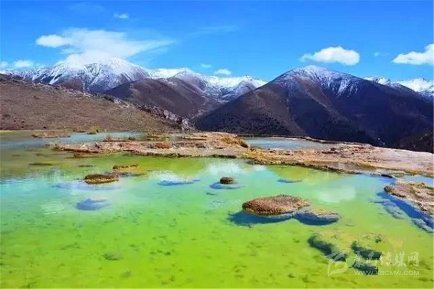泉華灘海拔約4000米,屬于高山河谷草甸地貌。東南面就是貢嘎山,這里是觀看“蜀山之王”的絕佳位置。它因一種含有大量化學(xué)物質(zhì)的泉水在地表產(chǎn)生化學(xué)沉淀而成,從另一個(gè)山頭傾斜下來大片的白色鈣化土,延伸到谷底后便變化出四層五彩的鈣化池。每個(gè)階地上有十幾個(gè)大小不同、形態(tài)各異的五色彩池,水深40-70厘米,彩池里水草相依,石花點(diǎn)點(diǎn),疑為瑤池降臨人間!