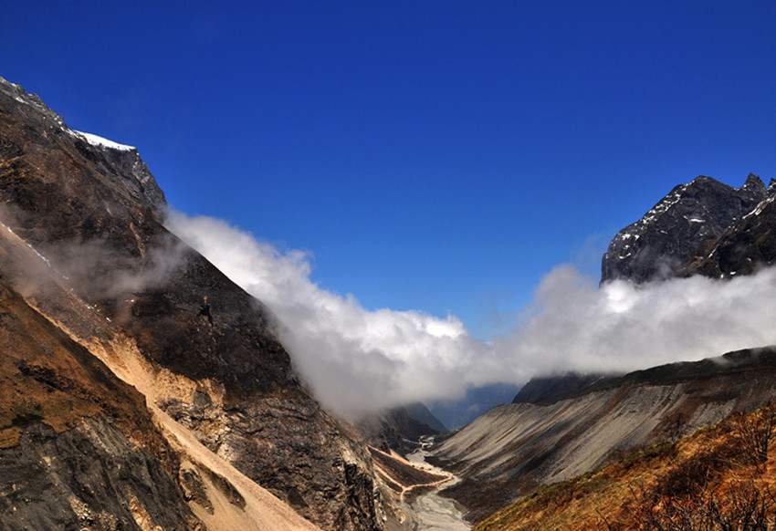 第二天,我們準(zhǔn)備游玩燕子溝,醒來(lái)的第一件事就是拉開(kāi)窗簾看看天氣,又一陣興奮,天氣依然非常晴朗,今天是進(jìn)燕子溝的第一天,我早做足了準(zhǔn)備,太陽(yáng)帽、墨鏡、食品等等一樣不少。從磨西到燕子溝溝口的路程很長(zhǎng),需要坐景區(qū)的觀(guān)光車(chē),因?yàn)樘鞖獾脑颍缴现挥猩傩┰旗F繚繞,環(huán)在山腰,仿佛是一幅山水畫(huà)景。我們先來(lái)到了冰窖口,這里的海拔有三千多米,所幸大家都沒(méi)有高原反應(yīng),后坐車(chē)下山,來(lái)到有“定海神針”之稱(chēng)的一棵高大筆直的杉樹(shù)。這棵杉樹(shù)皮粗厚,已經(jīng)沒(méi)有了樹(shù)葉,樹(shù)枝也寥寥無(wú)幾,更顯滄桑。站在樹(shù)下遙望,顯得人是那么渺小。不禁讓人遐想這顆千年古樹(shù)的滄桑歷史。然后開(kāi)始步行游玩,這里海拔比較低,走 起來(lái)不是很累,在城市中見(jiàn)慣了高樓大廈,車(chē)水馬龍的我們,此刻真有一種離開(kāi)凡塵,來(lái)到世外桃源的感覺(jué),我們一路依山而上,越走越高。我們終于來(lái)到了天藥水坪,這里的景色已經(jīng)完全不同于山下,看著遠(yuǎn)處的山,我們都不約而同地“哇”了一聲。