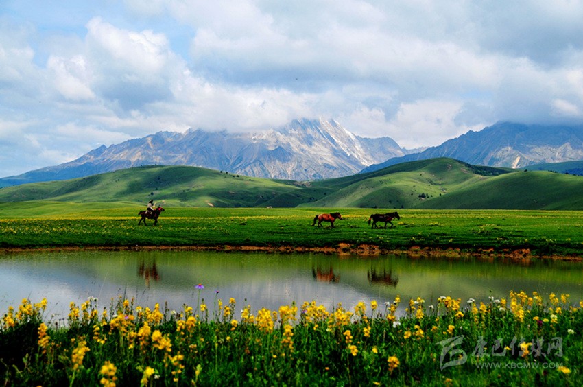 夕陽(yáng)照耀湖水,閃著金銀光;綠樹(shù)撐著青天,到處莽蒼蒼;牧民家的房子,五彩斑斕樣;藍(lán)色天空之上,白云在飄蕩;青石河岸之畔,繽紛百花香……這里是寫生的圣殿,這里有攝影的天堂,這里是讓人魂?duì)繅?mèng)縈的夢(mèng)里仙鄉(xiāng)。