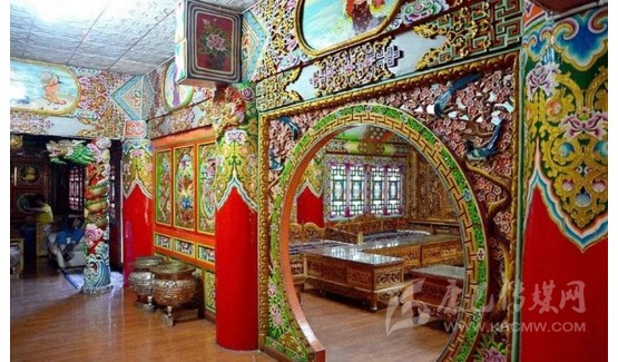 道孚民居室內(nèi)精雕細(xì)鏤,描金繪彩,每一個(gè)圖案或圖畫就是一個(gè)吉祥物或一個(gè)傳說(shuō)。民居客廳陳設(shè)豪華,富麗堂皇,極顯主人的富有;經(jīng)堂供奉佛像,酥油燈長(zhǎng)明,是家中的清靜之地;臥室多用箱式或椅式藏床,陳設(shè)溫馨而別具風(fēng)情。
