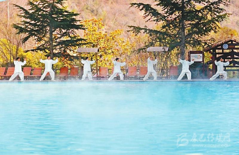游客在天然溫泉邊做康養(yǎng)運(yùn)動(dòng)。