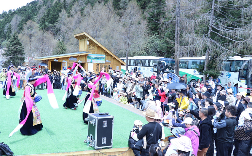 春雪消融,大地復(fù)蘇,高原上肅穆的景色正變得郁郁蔥蔥、多姿多彩起來(lái)。5月1日,康定情歌(木格措)風(fēng)景區(qū)天氣晴好,高山杜鵑在山澗中次第開(kāi)放,景區(qū)內(nèi)人流如織,游客有的是一家老小有說(shuō)有笑,有的是三五好友打卡拍照。行走在高山湖泊造就的自然環(huán)境中,耳畔是鳥(niǎo)兒和河水流動(dòng)的和聲,信步林間,牧歌牛群,木格措清凜可人。在木格措觀景臺(tái),還上演了14場(chǎng)藏族非遺歌舞,歡快的舞蹈和秀麗的風(fēng)光讓游客沉醉其中、留戀忘返。