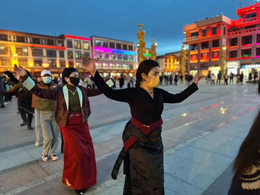 本網(wǎng)訊 每到傍晚時分,色達(dá)的金馬廣場上都會準(zhǔn)時響起起歡快的鍋莊曲。 舞者們雙手隨音樂自然張開,邁著輕快的步伐,踢腿、揚(yáng)手、轉(zhuǎn)圈。游客們有的拿起手機(jī)拍照留念,有的則加入鍋莊舞的隊(duì)列。