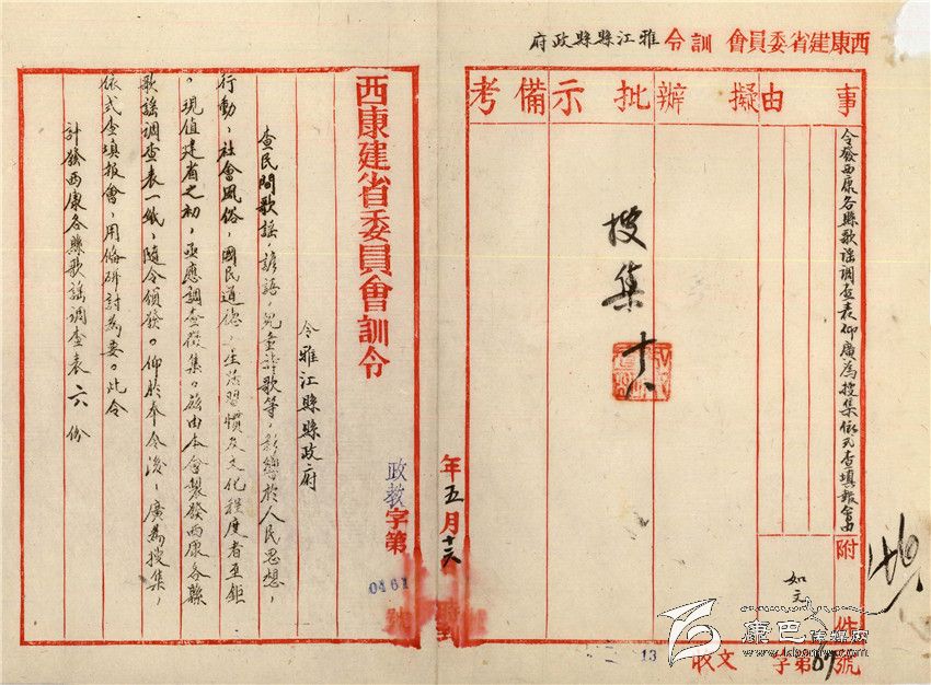 訓(xùn)令題目是“令發(fā)西康各縣歌謠調(diào)查表仰廣為收集依式查填報(bào)會(huì)”,由此可知,西康其他各縣也收到了同樣的訓(xùn)令。其內(nèi)容為:查民間歌謠、諺語,兒童詩歌等,影響于人民思想、行動(dòng)、社會(huì)風(fēng)俗、國民道德、生活習(xí)慣及文化程度者至巨?,F(xiàn)值建省之初,急應(yīng)調(diào)查征集,茲由本會(huì)制發(fā)西康各縣歌謠調(diào)查表一紙,隨令頒發(fā)。仰于奉令后,廣為收集,依式填報(bào)會(huì),備研討為要。此令,計(jì)發(fā)西康各縣歌謠調(diào)查表6份。署名是“西康建省委員會(huì)”。