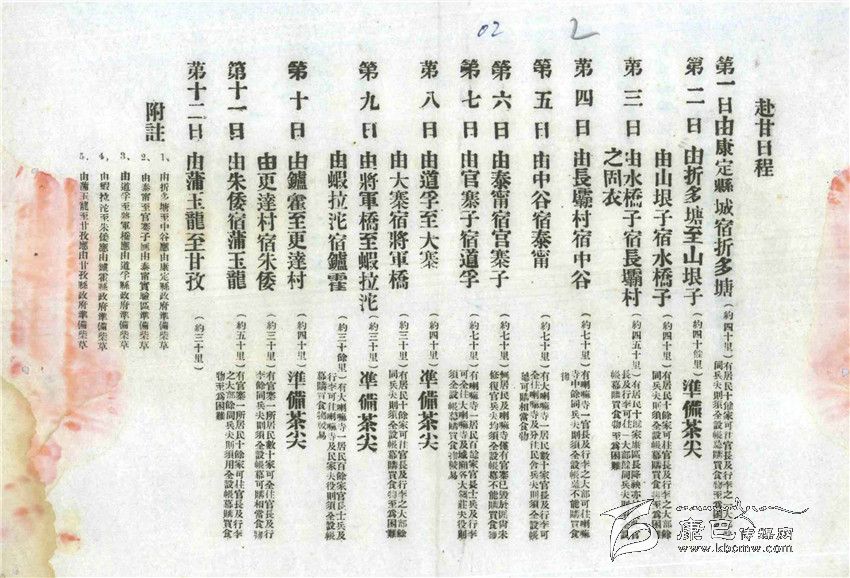 為了安排好戴院長(zhǎng)一行的行程,西康建省委員會(huì)專門(mén)發(fā)出了一份“訓(xùn)令”。這份時(shí)間表就是根據(jù)“訓(xùn)令”要求為戴院長(zhǎng)行程作出的安排。每天從何地到達(dá)何地,里程多少,休息地有無(wú)村莊、寺廟,接待力量如何、是進(jìn)房屋休息還是支帳篷都有說(shuō)明,而且對(duì)沿途各縣各地提出了包括應(yīng)準(zhǔn)備柴草、應(yīng)在哪些地方準(zhǔn)備“打尖茶”(午飯)等具體要求。