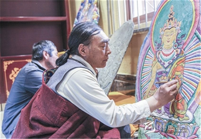 從子承父業(yè)再到吸眾家之長(zhǎng),自離開故鄉(xiāng)的那天起,巴德的視野開始變得開闊起來。1979年到省藏校學(xué)習(xí)藏文和美術(shù),并開始涉獵泥塑技藝,隨后又向德格民間藝人扎西澤郎學(xué)習(xí)彩繪石刻,然后又到西藏、甘肅等地學(xué)習(xí)繪畫、石刻技藝。巴德說,自己之所以有今天的藝術(shù)造詣,是因?yàn)橛幸慌麕熤更c(diǎn),是因?yàn)樽约旱牟粩嗵剿骱烷L(zhǎng)期堅(jiān)守。讓他欣慰的是,自己的三個(gè)兒子都在學(xué)習(xí)石刻和繪畫,親戚朋友中的十多個(gè)孩子也成了他的入門弟子。