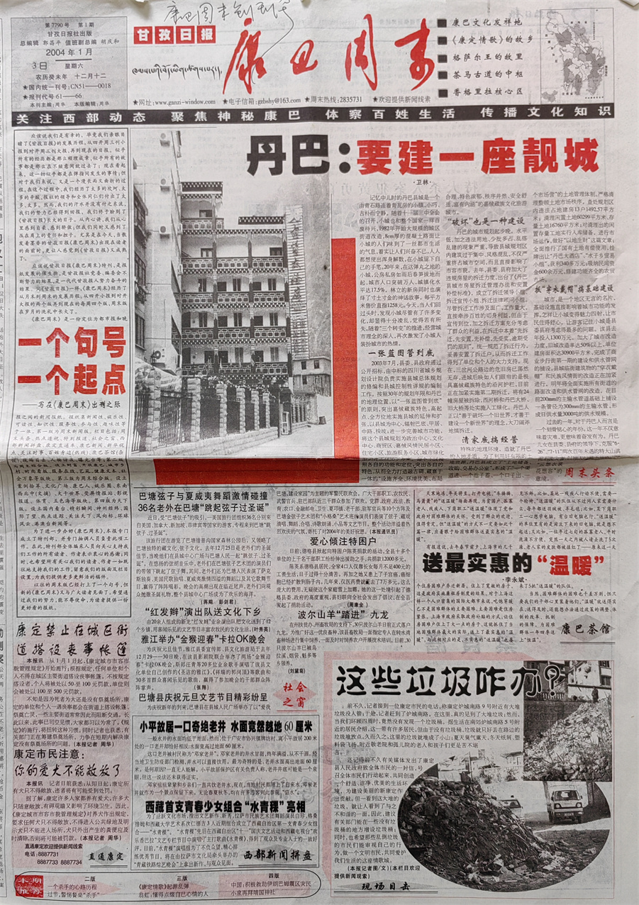 經(jīng)過緊鑼密鼓的籌措后,2004年1月3日,也就是在《甘孜報(bào)》正式改為《甘孜日?qǐng)?bào)》的第三天,第一期《康巴周末》與讀者見面了?!犊蛋椭苣穭?chuàng)刊號(hào)的報(bào)頭是時(shí)任《甘孜日?qǐng)?bào)》社副總編輯胡慶和先生書寫的,同時(shí)還配發(fā)了我撰寫的題為《一個(gè)句號(hào)、一個(gè)起點(diǎn)》的發(fā)刊詞。創(chuàng)刊號(hào)第一版推出的是周末新聞版,當(dāng)期與讀者見面的欄目包括:周末頭條、社會(huì)之窗、直通康定、現(xiàn)場目擊、康巴茶館、西部新聞拼盤等;第二版為周末綜合版,推出的是案例拾萃、健康文本欄目;第三版為周末綜合版,推出的是文化廣場欄目;第四版為天下版,推出的是國內(nèi)外奇聞逸事。此外,《康巴周末》創(chuàng)刊伊始,還推出了有獎(jiǎng)?wù)骷侣劸€索活動(dòng),凡是提供有一定新聞價(jià)值的社會(huì)新聞,經(jīng)采訪核實(shí)后,都會(huì)給予線索提供者一定獎(jiǎng)勵(lì)。這種線索征集活動(dòng),不但擴(kuò)大了新聞源,還在一程度上為《康巴周末》迅速贏得讀者的青睞起到了推波助瀾的作用。直到后來在舉辦《康巴周末》創(chuàng)刊一百期活動(dòng)時(shí),讀者還對(duì)此給予了充分肯定。