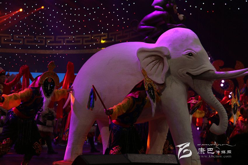 此次藏歷新年春晚被命名為“圣潔家園”,為了應(yīng)“家園”這個景,導(dǎo)演組頗有“心機”的將藏元素“和睦四瑞”搬上了舞臺,在開場舞中,兩個用石膏打造的、栩栩如生的“和睦四瑞”被演員緩緩?fù)粕衔枧_,贏得觀眾陣陣歡呼。在民間傳說中大象、猴子、白兔、貢布鳥共同發(fā)愿行持善法,貢布鳥鼓勵同伴們開始持守五戒,并一直堅持不懈動員其它眾生嚴(yán)守五戒。在它們帶動、勸說下,動物們都能漸漸做到互不損害、如理如法在木森林中和平度日,以其厲行善法之因,天人也降下和合雨水。后來,整個大地之上,莊稼豐熟、植物茂密、鮮妍之花滿目盛開,整個國家喜獲豐收、財富圓滿。晚會也是想利用“和睦四瑞”寓意人民生活團結(jié)和睦、和平寧靜的美好愿望。