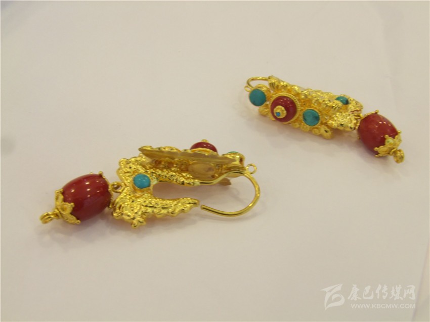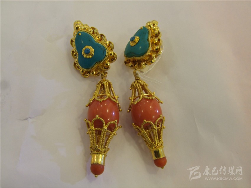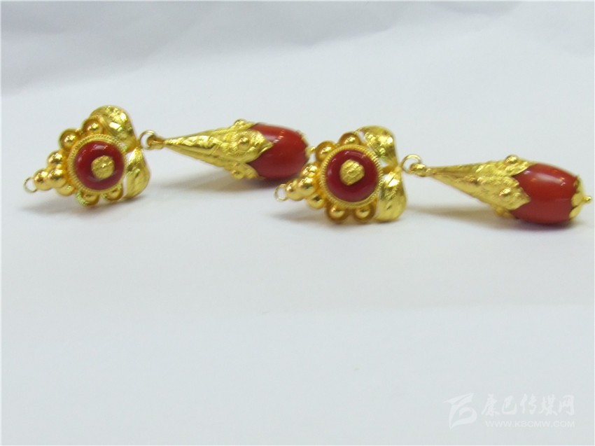 經典的紅綠配耳環(huán)。撞色一直都是永不落伍的時尚,紅綠搭配的巧合,是藏民族熱愛生命與熱情好客的象征,用流光溢彩的金色將紅與藍包圍并連接,看起來協調而美好,搭配起來更為時尚。據店家介紹,此款耳環(huán)凈重22.75克,加上手工費,售價7000余元。