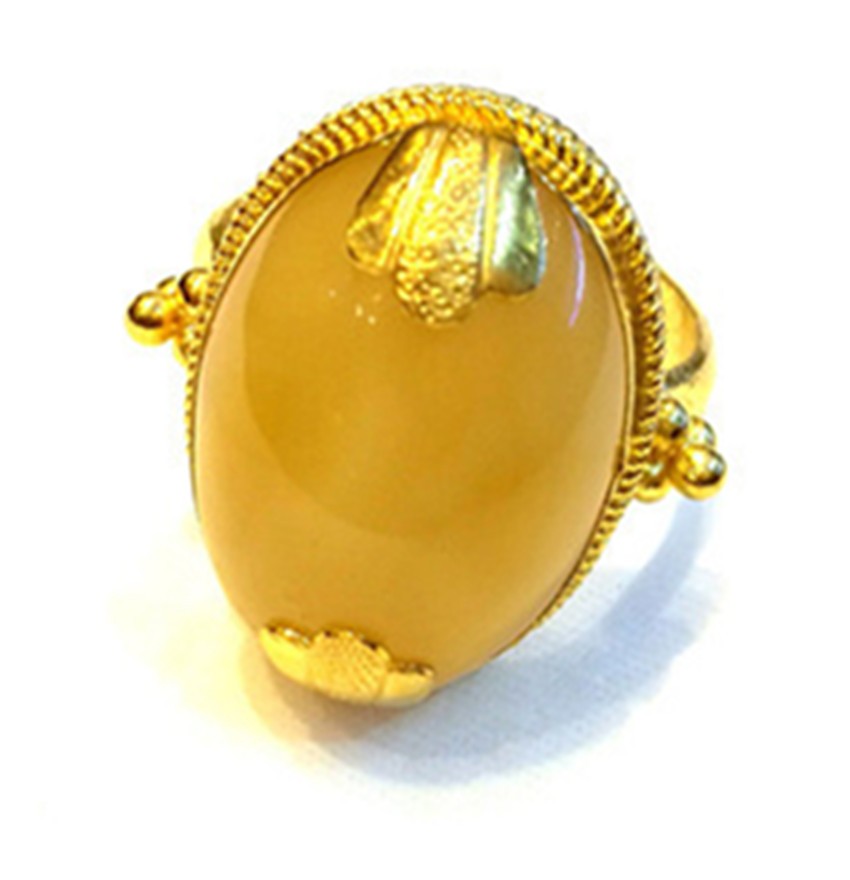 蜜蠟是藏家裝飾中的上成品,藏民族對蜜蠟的喜愛是非常誠懇的,表達著他們對大自然的無限崇敬之情與大自然饋贈的感謝之情。在他們看來,蜜蠟除了能夠作裝飾品佩戴、收藏之外,最引人注目的就是靈性修行之功效,設計師在此款戒指的設計上,緊扣藏民對蜜蠟的喜愛,并將漢式花邊與蜜蠟結合,是對藏漢文化交流較好的體現。