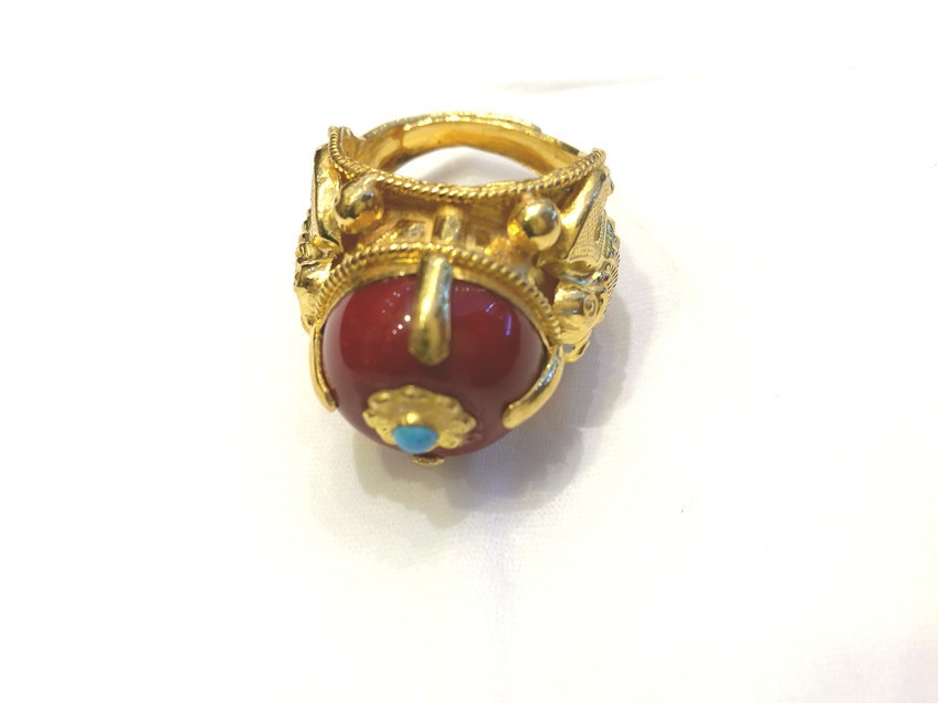 龍頭耳環(huán)在藏民族配飾歷史上較為久遠,設計師在遵循龍頭耳環(huán)傳統基礎上,結合當下的潮流,用紅藍寶石做點綴,并在紅色寶石上打上精美的黃金花,很好的詮釋了個性與時尚的結合。