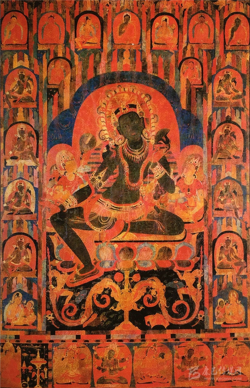 公元十三世紀,印度波羅王朝覆滅。佛教中心超戒寺被毀,大量的佛教藝術家和工匠逃到了尼泊爾馬拉王朝,所以尼泊爾的藝術是從這個時期開始發(fā)展強大的,這相當于是“藝術的接棒”。尼泊爾的繪畫風格,就沒有石窟的概念了,透視立體也逐步被消解,然后用卷草等紋樣填滿背景,畫面變得平面化、精致化了。