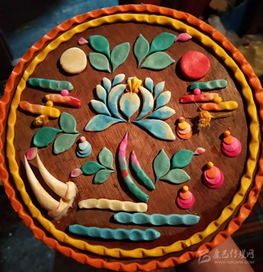 創(chuàng)作酥油花的工序是復(fù)雜、細致的:首先是確定油塑的題材,塑什么花,必須報請寺主審查通過;其次是揉和酥油,將各種顏料與酥油調(diào)和成彩色酥油;接下來是塑造基本模型,并按草圖扎制花架,涂塑鮮花的形體,將花朵、花葉、花莖安裝到花架上;最后,用金彩粉對整個酥油花進行勾勒和裝飾……酥油花終于宣告塑成。