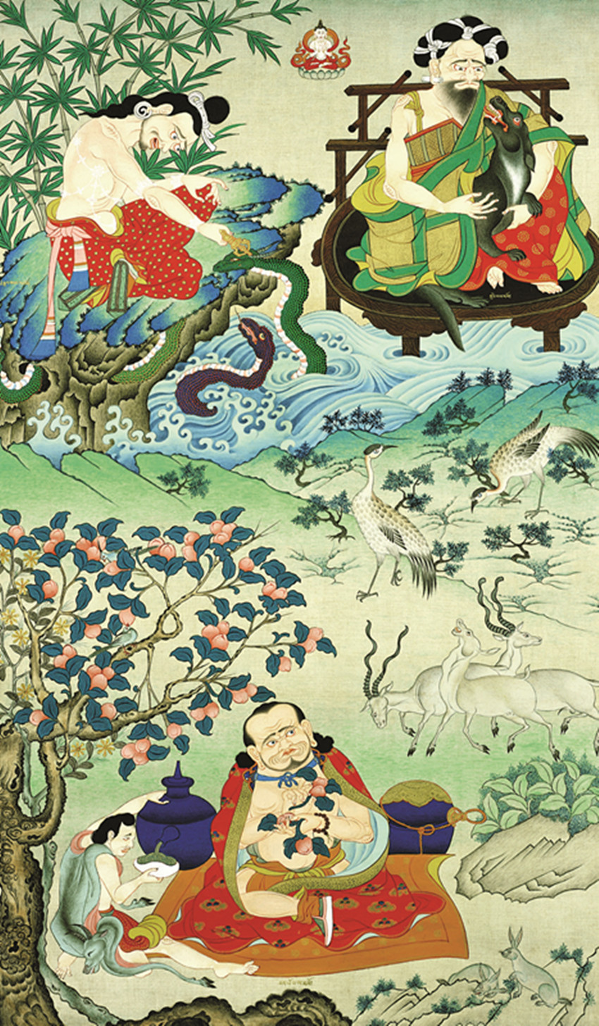 欽孜派的開山鼻祖是貢嘎崗堆·欽則欽莫。從技法上講,勉唐、欽孜兩派的技法都是繼承尼泊爾繪畫“重彩平涂”的畫法,欽孜畫派還擅長對(duì)同類色的豐富調(diào)配,以及在石色之上用透明色暈染的技法使用。從風(fēng)格上看:兩派有著相同的藝術(shù)追求,但欽則畫派是在保守的創(chuàng)新,雖然它也吸收漢地藝術(shù)畫了很多山水,但它的山水元素只是為了填補(bǔ)畫面,沒把背景山水從作為一幅畫來考量;它的畫面常用直線形來分隔風(fēng)景,近似像平涂色塊的版畫。(未完待續(xù))