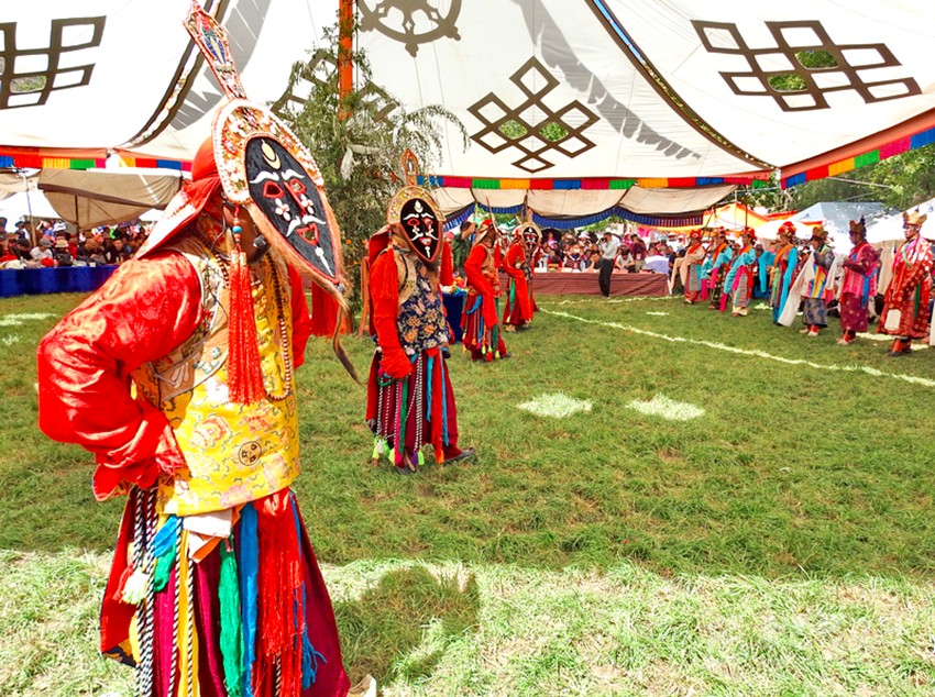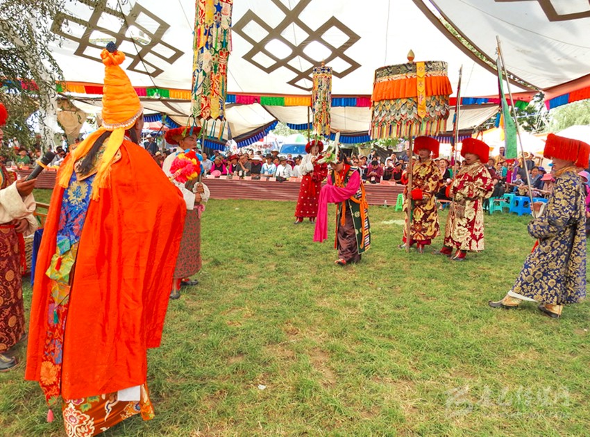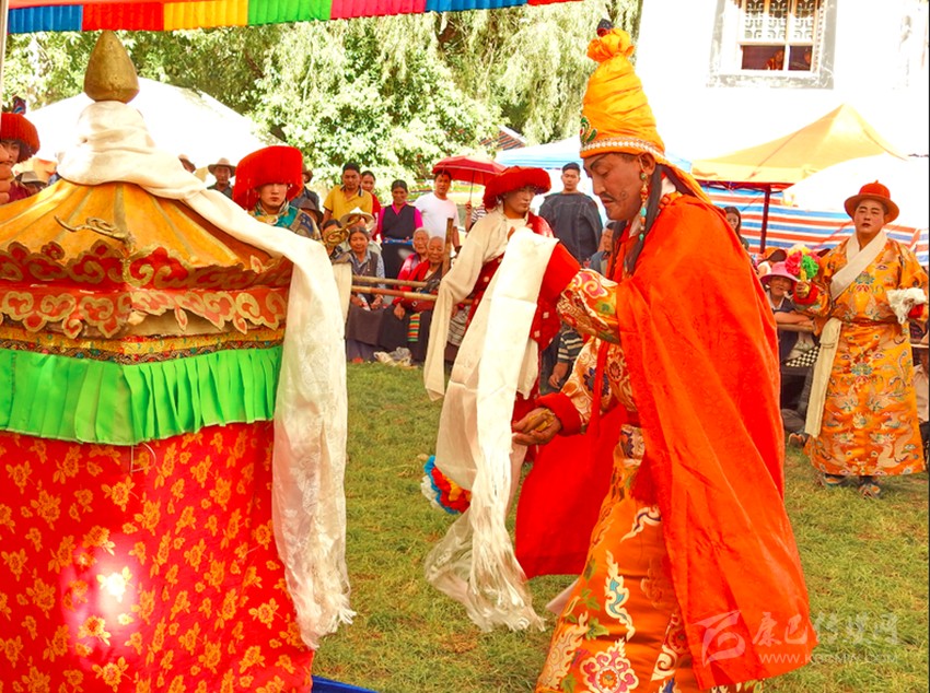 初次看到巴塘藏戲是康巴衛(wèi)視藏歷春晚,原以為是寺廟舞蹈,在唱聲杳杳里類似川劇的喉腔讓我覺得新奇,于是找些資料看看了巴塘藏戲介紹。藏戲的開山鼻祖唐東杰布。藏民歷來把他看作是創(chuàng)造藏戲的戲神和修建橋梁的鐵木工匠的“祖師”,是藏族人民心目中智慧、力量的化身。他將佛教經(jīng)典中的傳記同民間傳說、神話故事等內(nèi)容融在一起,創(chuàng)作出一種具有人物性格和舞蹈、唱腔相結(jié)合的表演藝術(shù),使過去單一的跳神舞逐漸地戲劇化,表現(xiàn)手段也不斷加強(qiáng),并從宗教儀式中分離出來,形成了藏劇藝術(shù)的雛形。