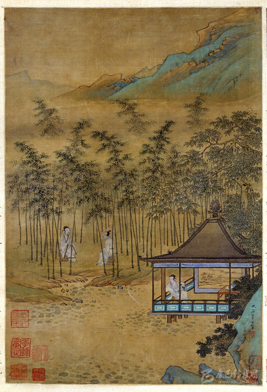 此圖意境極像唐代詩人王維的藍田山別墅。這里林木茂密,山澗淙淙,館舍、房屋散布其間,每到夏季,山風習習,涼爽怡人,王維和文友們在此度夏避暑,垂釣飲酒,談論詩文,修身養(yǎng)性,過著悠閑自在的隱居生活。他在《竹里館》一詩里寫過自己的隱居快樂感受:“獨坐幽篁里,彈琴復長嘯。深林人不知,明月來相照?!比姼裾{(diào)幽靜閑遠,仿佛詩人的心境與自然的景致全部融為一體了。宋朝詩人楊萬里喜歡在皎潔的月光之下,清輝孤影,來到搖曳的竹林中,聽著夏夜里悅耳的蟲鳴,夜深氣清,盡管沒有涼風送爽,但是悶熱暑氣頓時消失,于是他寫了一首《夏夜追涼》詩:“夜熱依然午熱同,開門小立月明中。竹深樹密蟲鳴處,時有微涼不是風?!?/span>