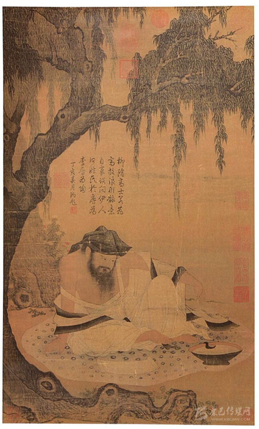 陶淵明曾說:“夏月虛閑,高臥北窗之下,清風颯至,自謂羲皇上人?!币粋€高人隱士酒后高臥草廬窗下,悠閑自得乘涼的形象躍然紙上。唐代詩人李白非常向往陶淵明恬淡閑逸、與世無爭、天人合一的隱逸生活,寫詩曰:“陶令日日醉,不知五柳春。素琴本無弦,漉酒用葛巾。清風北窗下,自謂羲皇人。何時到栗里,一見平生親?!北磉_了對陶淵明人品和理想的仰慕之情?,F(xiàn)藏于臺北故宮博物院的宋人《柳蔭高士圖》即是此意境。據(jù)《石渠寶笈》記載,此圖為素絹本著色畫,左方下有孫承澤印,右方下有北平孫氏印,左邊幅有棠村審定、蕉林二印。只知為宋人之作,相關(guān)的背景則無從查考。畫中為一棵古柳樹,樹干虬曲剛勁,枝葉繁茂。樹下一翁,美髯飄忽,袒胸露腹,頭戴葛巾,赤足席地而坐。坐前有一幅展開的手卷,酒樽滿盈,淺斟低酌。表面上看此翁雙目聚神,凝視手卷,實則已是眼餳耳熱,醺醺然不勝桮杓。清乾隆皇帝對《柳蔭高士圖》十分喜愛欣賞,在畫上御筆題詩云:“柳蔭高士若為高,放浪形骸意自豪。設問伊人何姓氏,于唐為李晉為陶?!鼻〉壅f,這位高士如是唐人就是李白,如是晉人便是陶淵明。但是從服飾和環(huán)境看,應是五柳先生陶潛也。這幅圖所表現(xiàn)的就是“心靜自然涼”。