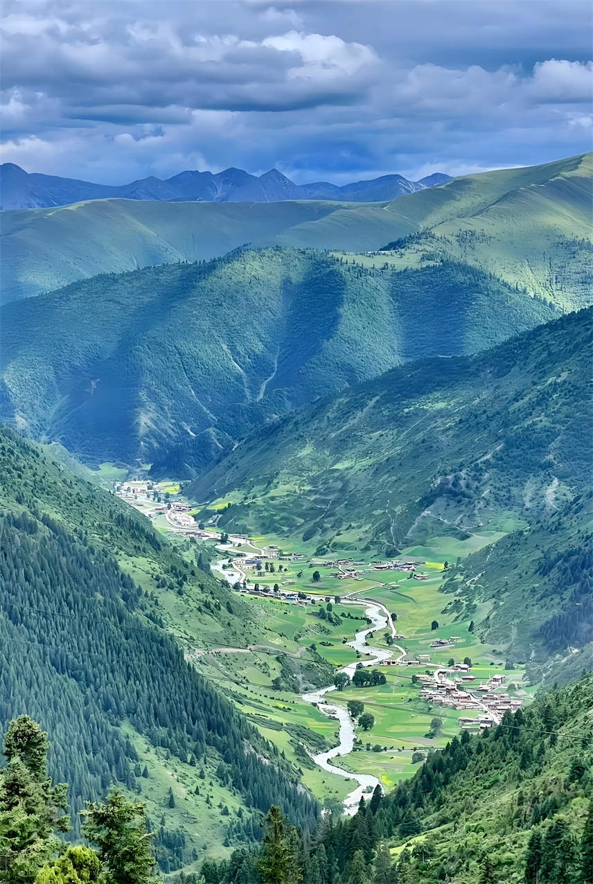 眼前,河谷兩旁的青山上,長(zhǎng)滿參天古樹,像一個(gè)個(gè)衛(wèi)士守護(hù)著這片綠洲;沙魯里山脈的冰雪融水順著蜿蜒的麥曲河,澆灌著兩旁綠意蔥籠的青稞地、豌豆地,滋潤(rùn)著彌漫香味的種有中藏藥材的土地;絳紅色藏房散落在河谷間,不時(shí)有小孩打開窗戶,探出小腦袋,羞澀地露出滿臉燦爛的笑容;臉上布滿高原紅的阿姐沖我們打招呼,說著我們不太懂的藏語,充滿熱情。