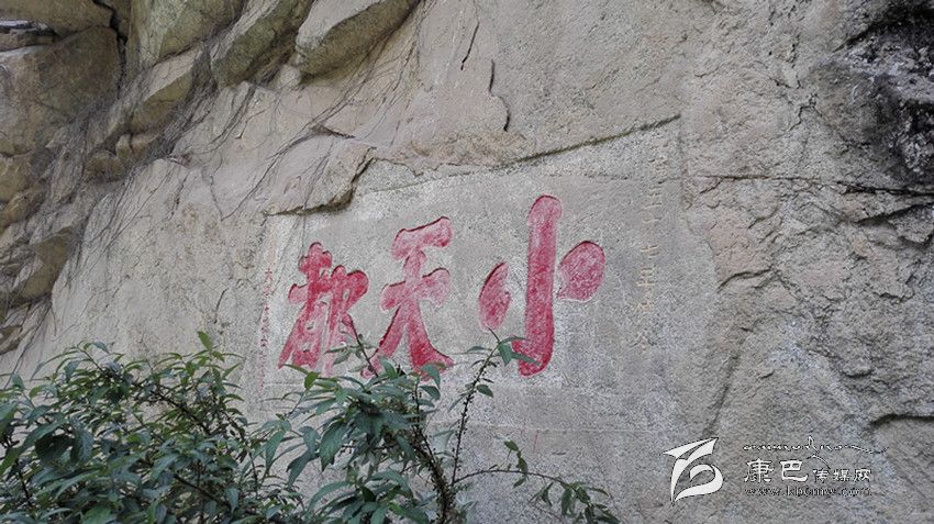 前些年,康定在此處修建水電站及公路,大量石塊隨意處置,沿路堆下,“小天都”三字幾被覆蓋。據當?shù)厝苏f,以前此三字高懸半空,現(xiàn)已可以攀巖而上。