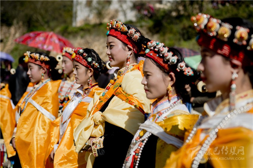 盤好發(fā)髻,佩戴好頭飾,在肩、背系好五彩哈達后,由本村具有威望的女性長者引領(lǐng)來到儀式現(xiàn)場。法號聲中,煨桑的青煙裊裊升起,威嚴的活佛主持誦經(jīng)祈福儀式。隨后,德高望重的長者為參加儀式的女子送祝福茶,長輩為姑娘們獻哈達。一系列儀式結(jié)束后,無論男女老少,都來到場地中央,踏歌起舞,跳起吉祥的鍋莊。