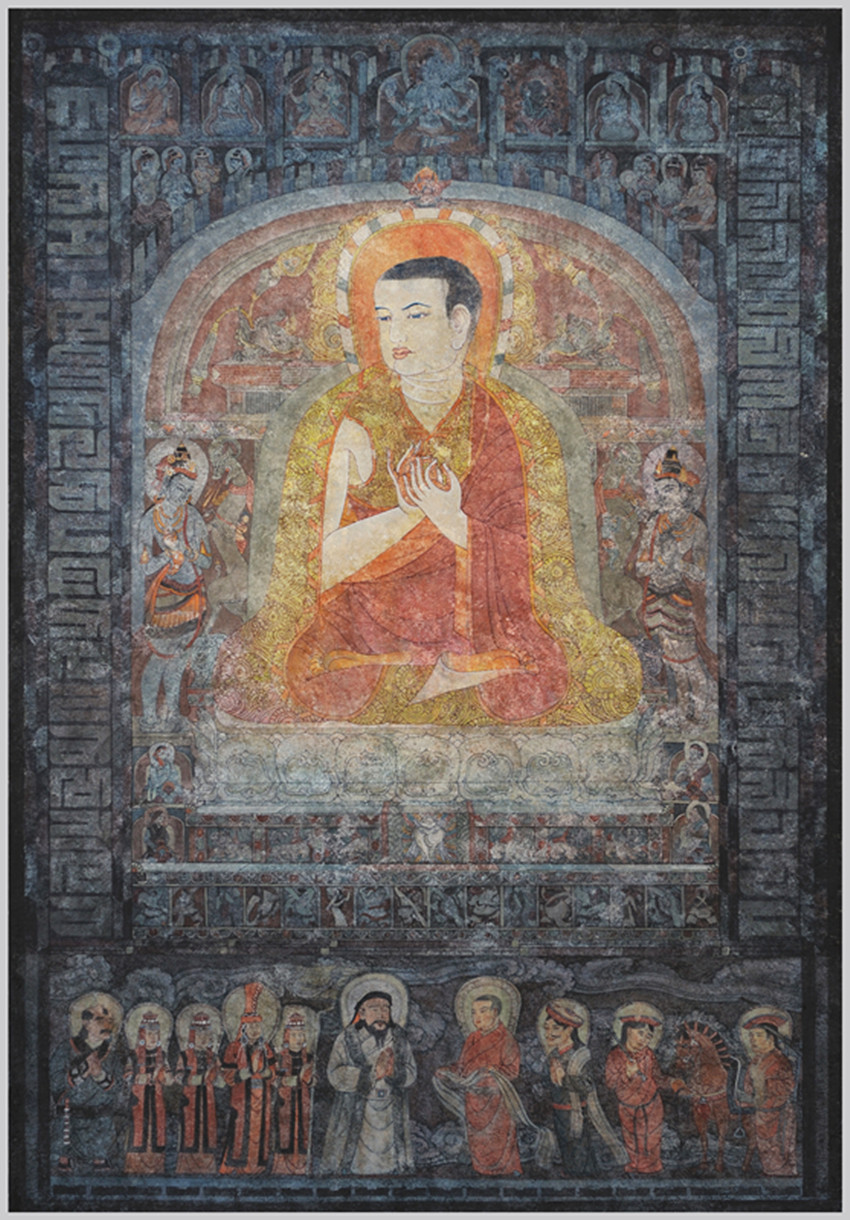 從“三怙主”往兩邊發(fā)展,分別是早期“薩迦五祖”中的前“四祖”:初祖貢噶寧布(1092--1158年);二祖索南孜摩(1142--1182年),三祖扎巴堅(jiān)贊(1147--1216年),四祖貢噶堅(jiān)贊(1180--1251年),即“薩迦班智達(dá)”。而薩迦第五祖就是畫面正中的八思巴(1235--1280年)。根據(jù)藏文史料,薩迦五祖中的前三祖稱為“白衣三祖”,因?yàn)樗麄兌紱]有正式出家受比丘戒,而是身著俗衣以居士身份自居;后二祖稱為“紅衣二祖”,因?yàn)樗麄z正式出家為僧,受過比丘戒,身著紅色袈裟。1253年夏天,忽必烈的軍隊(duì)到達(dá)六盤山一帶,請八思巴到軍營一敘,雖然有的史書記載之前八思巴就與忽必烈見過面,但這次是八思巴第一次以薩迦教主身份正式會見忽必烈。畫面的下方表現(xiàn)的就是“六盤山相會”的歷史場景。畫面右邊是八思巴一行列隊(duì)迎接的場面。中間著紅色吐蕃服裝者即是八思巴,他手捧哈達(dá)、神情莊嚴(yán)的給忽必烈獻(xiàn)上哈達(dá),紅色吐蕃衣服暗示他當(dāng)時(shí)還未受比丘戒的“紅衣”身份;在他身后哈達(dá)搭肩、雙手合十者為其弟恰那多吉,藏青色衣服暗示他的俗人身份;隊(duì)列后面是兩位服侍教主的僧侶,他們頭戴吐蕃氈帽、牽馬負(fù)笈等候在一旁。左邊是蒙古王族的儀仗隊(duì)列,為首便是身著白色裘衣的忽必烈。其后是三個(gè)侍女簇?fù)碇牟毂赝蹂谝晃皇膛鲋砘首宓娜A蓋,而淡青色華蓋說明:忽必烈當(dāng)時(shí)尚未繼承蒙古大汗位。察必王妃和侍女皆穿著紅色的蒙古弘吉剌部落服裝,所不同的是王妃服飾比侍女服飾更顯尊貴和優(yōu)雅;隊(duì)伍的最后是一位穿著青衣、佩戴短刀的蒙古侍衛(wèi)。整個(gè)蒙古王族隊(duì)列面對將來的帝師八思巴,大家都謙遜、虔誠、靜穆地雙手合十致意。忽必烈、察必王妃以及八思巴的形象是根據(jù)古代繪畫作品和文字描述而創(chuàng)作的,服飾、用具、民風(fēng)民俗也都經(jīng)過仔細(xì)的研究考證。畫面兩邊是用“八思巴文”的字母組成的紀(jì)念柱,彰顯八思巴創(chuàng)立“蒙古新字”的功勛。受忽必烈指派,八思巴借鑒藏文拼讀方式創(chuàng)制出由41個(gè)字母構(gòu)成的一種新文字,其語音拼讀均按蒙語,又稱“八思巴蒙文”。八思巴向忽必烈呈獻(xiàn)蒙古新字后,忽必烈極為高興,并於1268年下詔,凡是詔書及各地方公文等均必須使用蒙古新字,在全國范圍內(nèi)推行這種新文字。