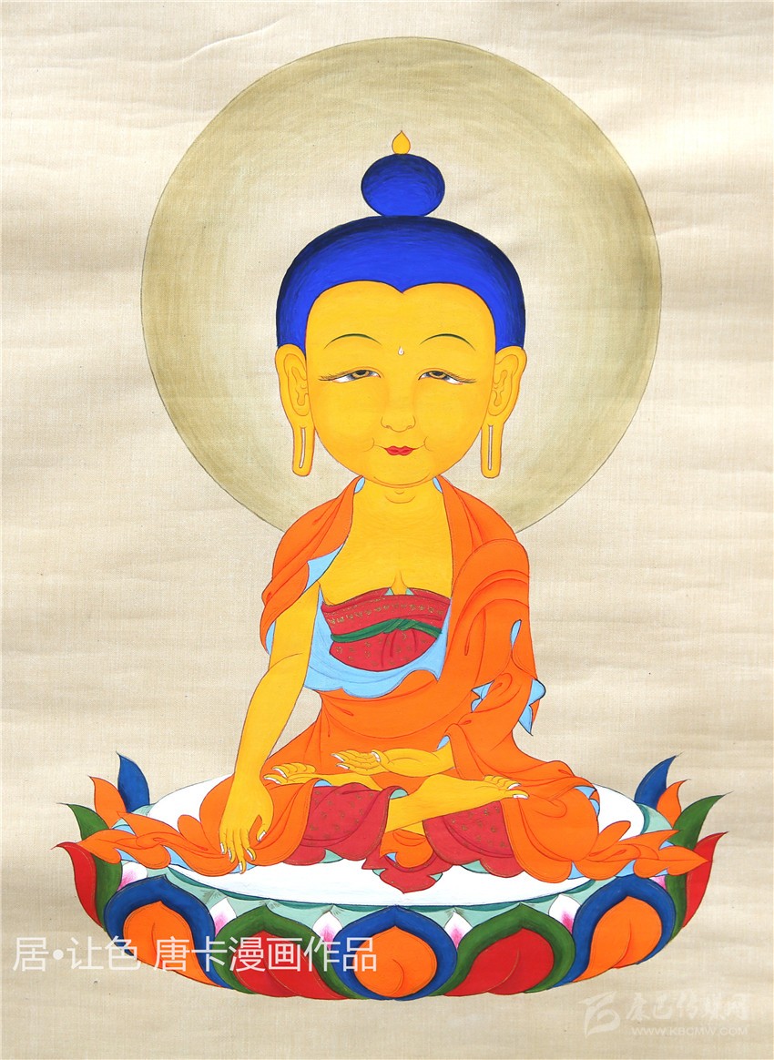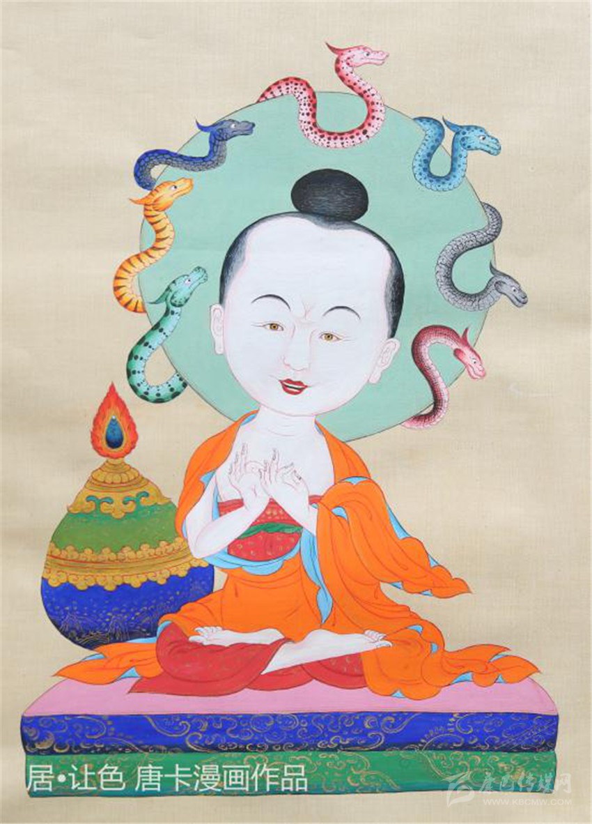 唐卡是藏族最具代表性的藝術(shù)門類之一,在其千年的傳承歷史中吸收融合了印度、尼泊爾等多地的藝術(shù)元素,發(fā)展成為極具雪域特色和審美價值的藝術(shù)形式。傳統(tǒng)唐卡缺乏立體感和形象感,畫面層次模糊,人物形象單薄,不利于民族文化傳承,“對于不懂畫的人來說,這種畫法他們看不懂?!被诖?,居·讓色對唐卡繪畫技法作了改良,結(jié)合現(xiàn)代漫畫,以寫實的手法,實現(xiàn)活態(tài)傳承、永續(xù)流傳目的。