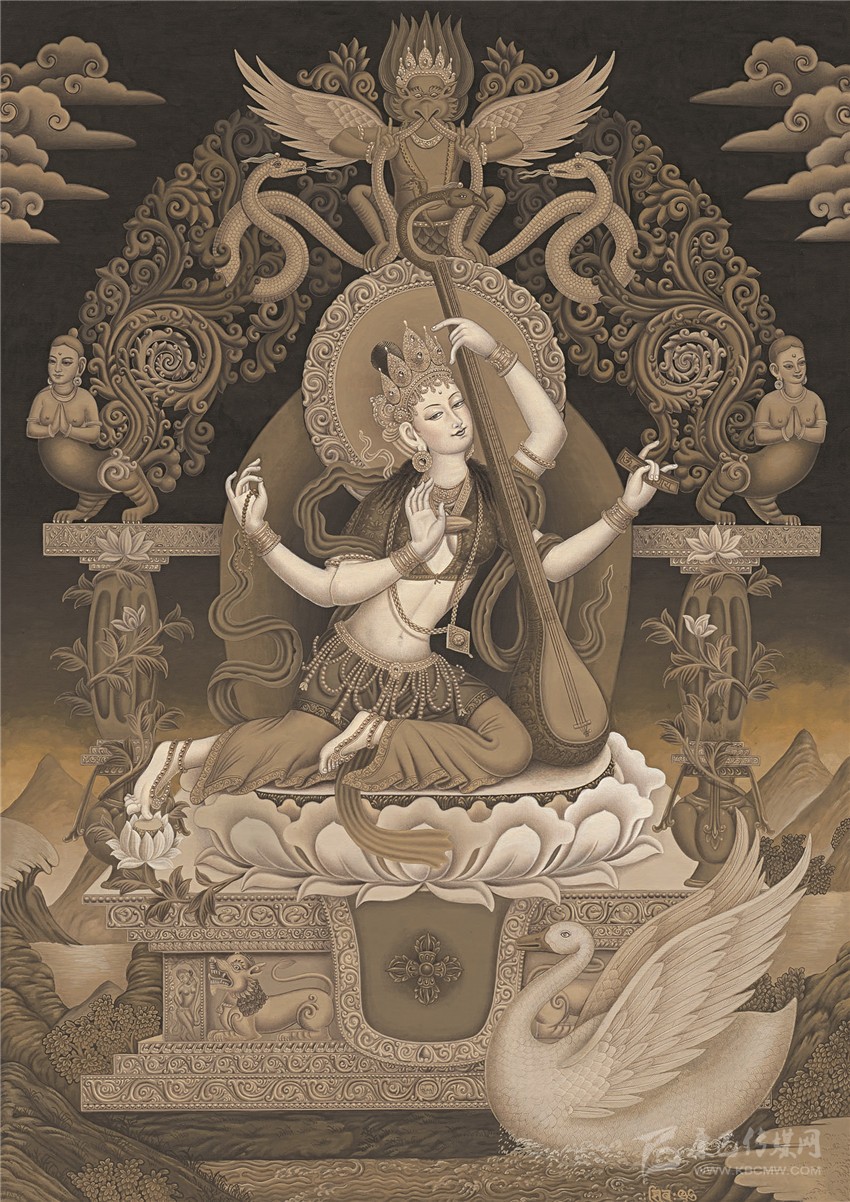 (一)對(duì)比色調(diào):畫面顏色干凈,對(duì)比強(qiáng)烈,大多用對(duì)比色來彰顯力量;施金華麗、燦爛而不泛濫。(二)暗色調(diào):畫面明度較低,常用黑色、藏青、絳紅、深綠來調(diào)劑各類原色,使得畫面色彩沉郁中透露出清新、凝重中綻放出優(yōu)雅,色彩的過渡細(xì)膩而豐富。(三)素色調(diào):尼瓦爾唐卡最有特色的就是“素色調(diào)”的唐卡(簡(jiǎn)稱“素唐”)。筆者之所以稱其為“素色調(diào)”而不稱作“黑白”或“單色”,是因?yàn)楫嬅骐m然沒有明顯的色彩,但是也非單一的黑色或灰色。它不僅調(diào)配了從深到淺的許多色階;還有雅致的黃灰、曠遠(yuǎn)的藍(lán)灰、宏大的紅灰等諸般色相的交響以及微妙的冷暖搭配,整體呈現(xiàn)出夢(mèng)幻般的美感。