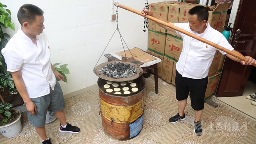 用酥皮包裹好餡料,放入模具內(nèi)壓緊壓實(shí)。點(diǎn)心脫模后在點(diǎn)上屬于“周聾子點(diǎn)心”的獨(dú)家標(biāo)記(四瓣花),便可進(jìn)入烤制流程,烤爐分為上鏊與下鏊。首先將吊爐上下火都提前預(yù)熱至250°左右,然后把制作好的點(diǎn)心正面朝下放在吊爐里,最后將上鏊移入吊爐上方,進(jìn)行點(diǎn)心的烤制。根據(jù)經(jīng)驗(yàn)確定烤制時(shí)間,當(dāng)?shù)鯛t里飄出香味后,即可將上鏊挪離吊爐。點(diǎn)心背面呈現(xiàn)出“偷油婆色”(焦黃色)后,迅速將點(diǎn)心翻面,繼續(xù)烤制成褐色,出爐即可食用。