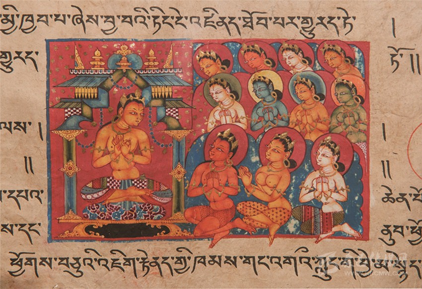 酥油燈點(diǎn)了一天又一年,千載之后墻壁熏得黝黑,曾經(jīng)絢爛無(wú)比的丹青圖畫就潛藏在這黝黑里,若隱若現(xiàn);一幀一鋪既是圣者傳奇,也是故國(guó)的見證。一頁(yè)帶插圖的經(jīng)書陳列在墻角柜子里,看守喇嘛捧與我們頂禮膜拜。經(jīng)書上畫著佛的前世(或某位菩薩)在廟堂上說(shuō)法,雙手結(jié)說(shuō)法印、上身著金釧瓔珞、下身著彩裙、跏趺坐于錦墊之上。他目光溫和注視著信眾,講到妙處有金色天花墜落。十一位華美的各色婦人蹲踞于前、雙手合十聆聽;前排三人抬頭看見空中落下的花雨,不禁歡喜贊嘆……