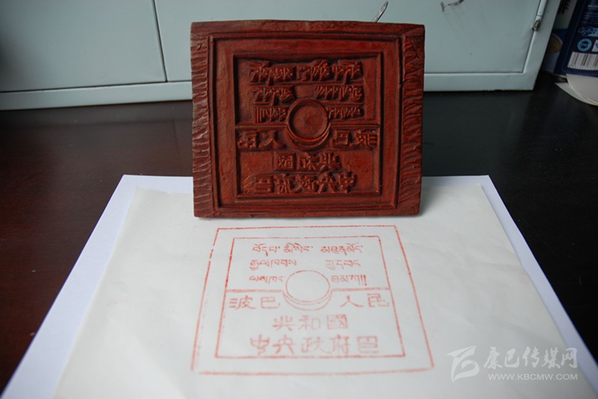 日月同輝的造型、藏漢雙語的文字,這一枚木質印章,高1.5厘米,長寬皆為12厘米,印面刻著藏漢雙語“波巴人民共和國中央人民政府印”。