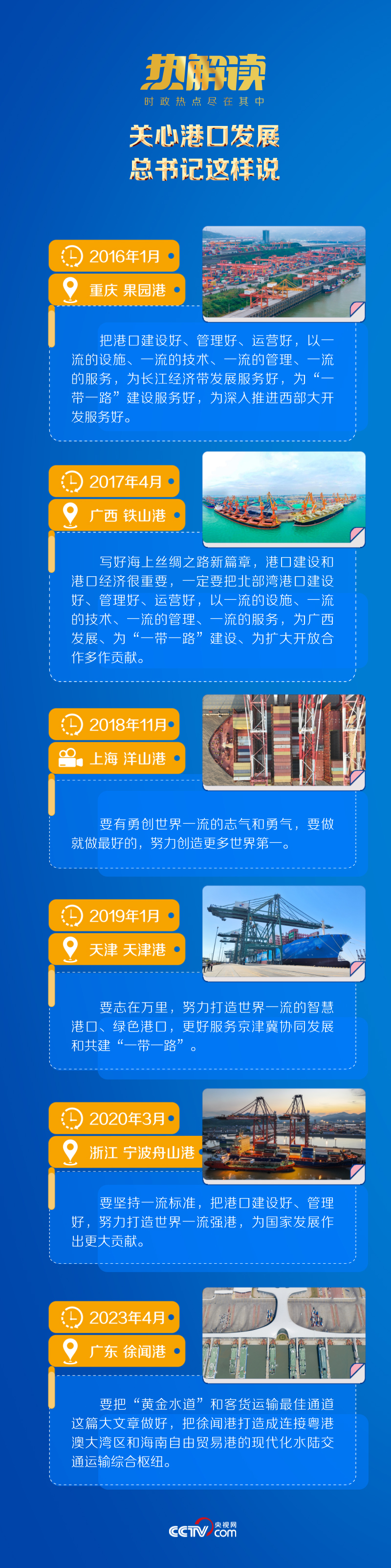 總書(shū)記曾深刻指出:“經(jīng)濟(jì)強(qiáng)國(guó)必定是海洋強(qiáng)國(guó)、航運(yùn)強(qiáng)國(guó)。”他希望我國(guó)港口建設(shè)“要志在萬(wàn)里”,“為國(guó)家發(fā)展作出更大貢獻(xiàn)”。