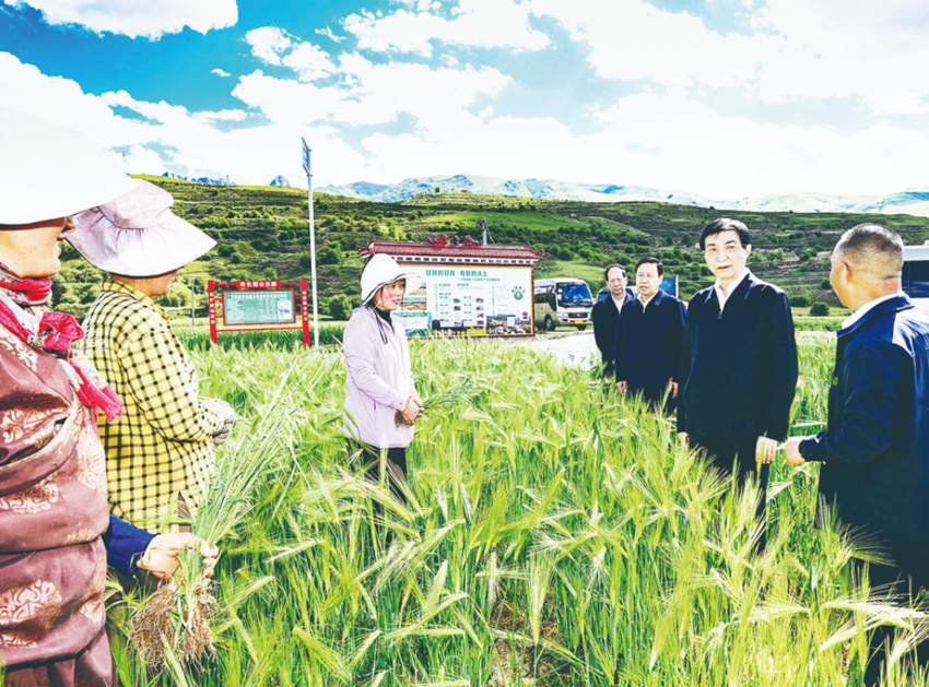 7月1日至3日,中共中央政治局常委、全國(guó)政協(xié)主席王滬寧在四川甘孜、阿壩調(diào)研。這是7月1日王滬寧在甘孜縣了解青稞生產(chǎn)情況。 新華社記者 饒愛(ài)民 攝