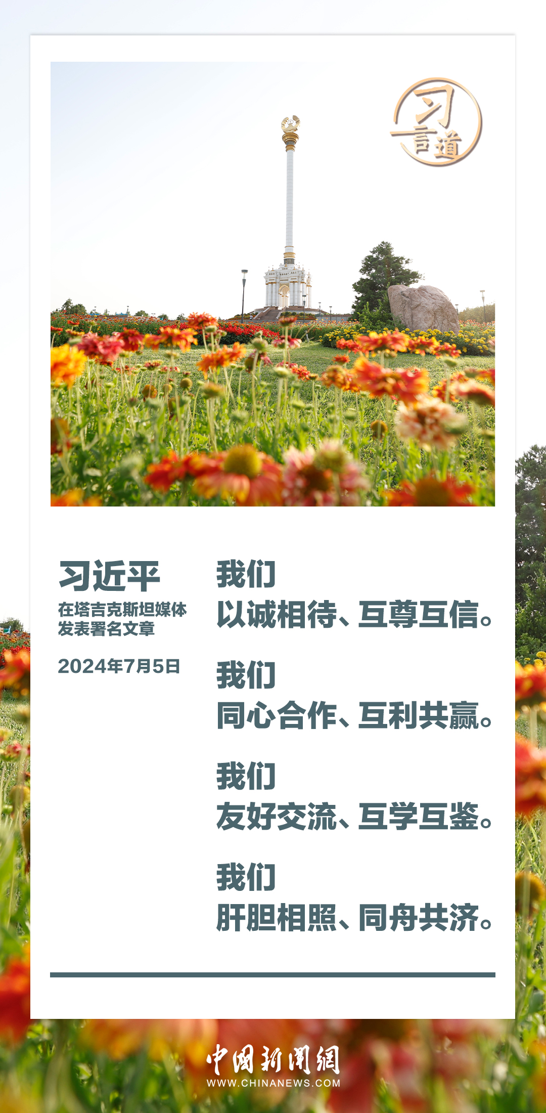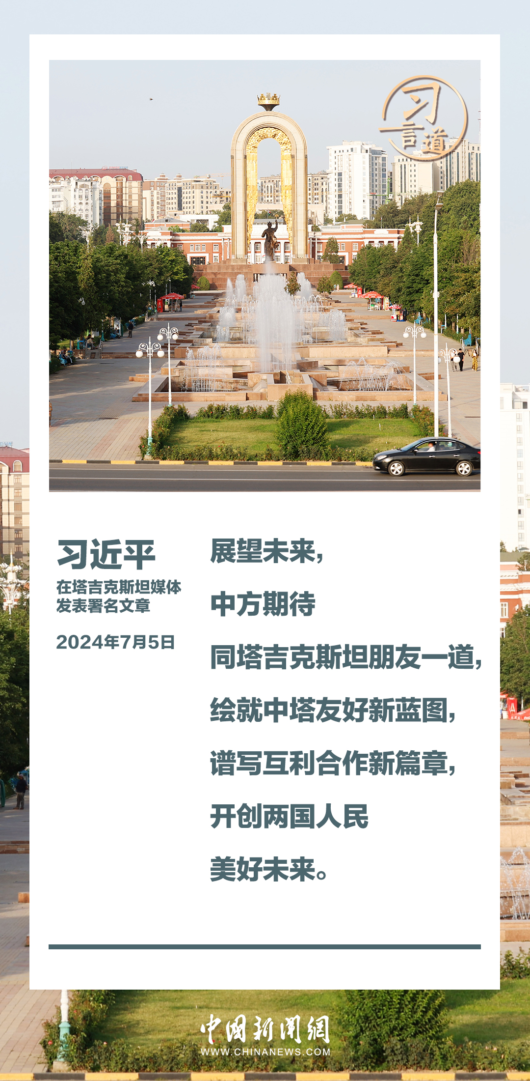 7月5日,在對(duì)塔吉克斯坦進(jìn)行國事訪問之際,國家主席習(xí)近平在塔吉克斯坦《人民報(bào)》和“霍瓦爾”國家通訊社發(fā)表題為《共創(chuàng)中塔關(guān)系美好明天》的署名文章。習(xí)近平指出——