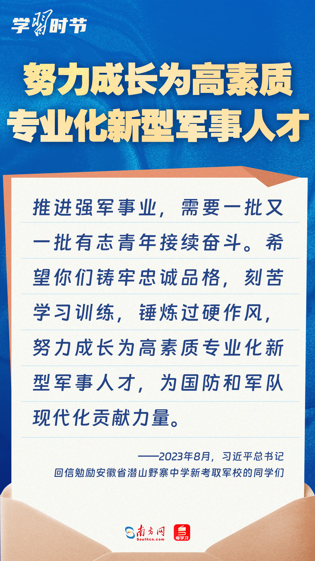 強(qiáng)國必須強(qiáng)軍,軍強(qiáng)才能國安。黨的十八大以來,習(xí)近平總書記始終牽掛一線官兵冷暖,高度重視我軍院校教育和人才培養(yǎng)工作,多次給部隊(duì)官兵、軍校學(xué)員等回信。讓我們一起重溫總書記的諄諄寄語!