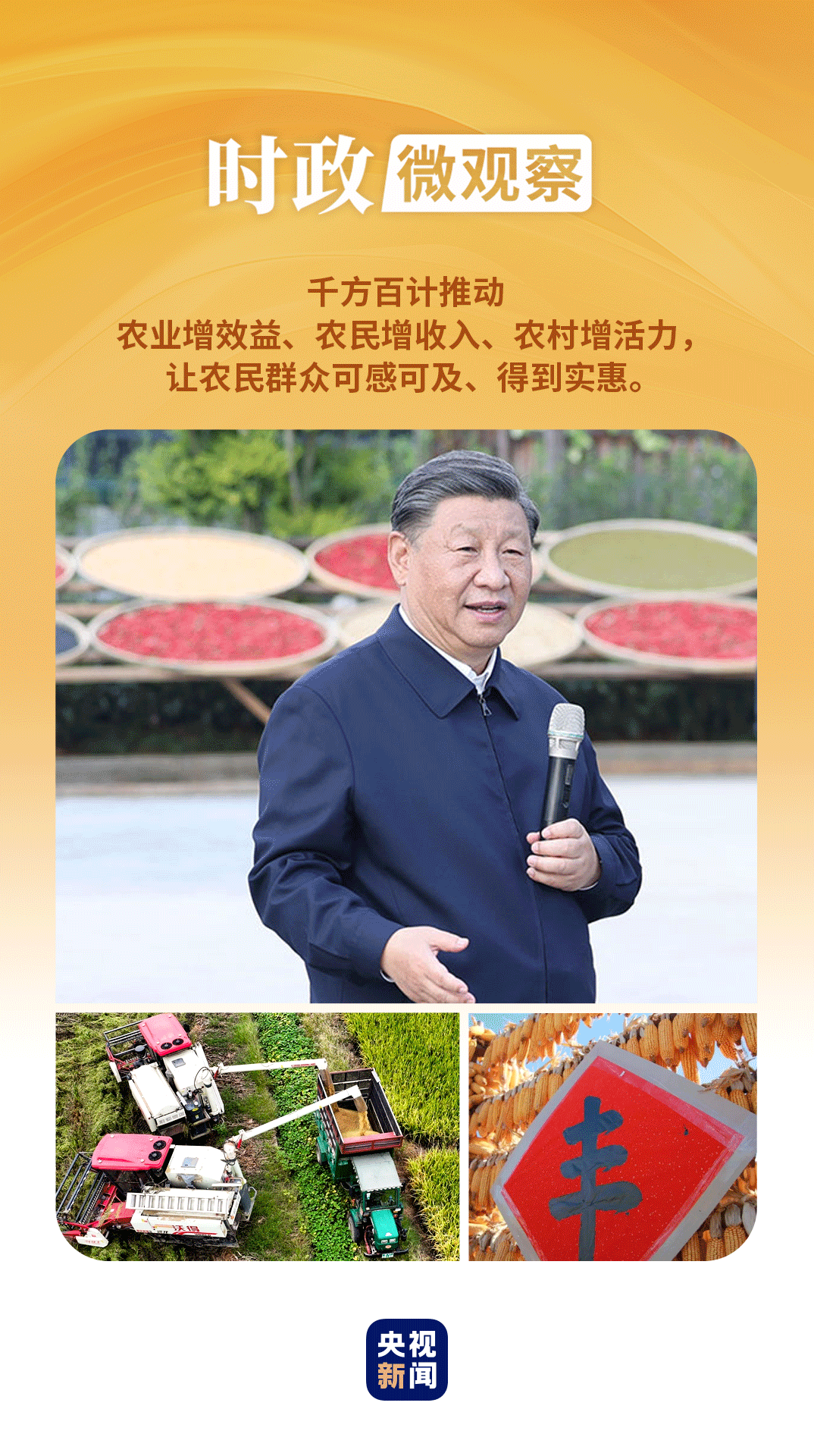 在第七個“中國農(nóng)民豐收節(jié)”到來之際,習(xí)近平總書記代表黨中央,向全國廣大農(nóng)民和工作在“三農(nóng)”戰(zhàn)線上的同志們致以節(jié)日祝賀和誠摯問候,對于堅持不懈夯實農(nóng)業(yè)基礎(chǔ),推進鄉(xiāng)村全面振興提出殷切期望和要求——